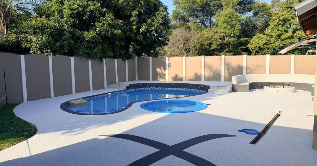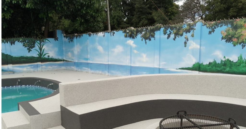 The mural now enhances the showroom experience by helping customers visualize their own backyard oasis while exploring Cosmo Pools installations.